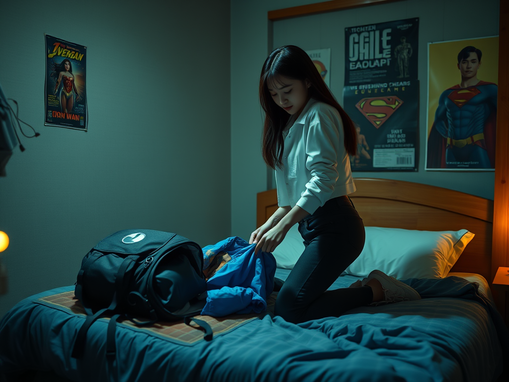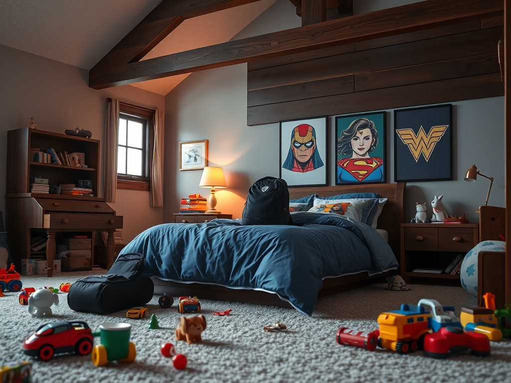 You laid your backpack on the bed and let your dainty hand glide across the blue Iron Man duvet. Your eyes moved slowly to the Wonder Woman and Superman posters above the cherry headboard — their glossy stares sharp, disapproving.