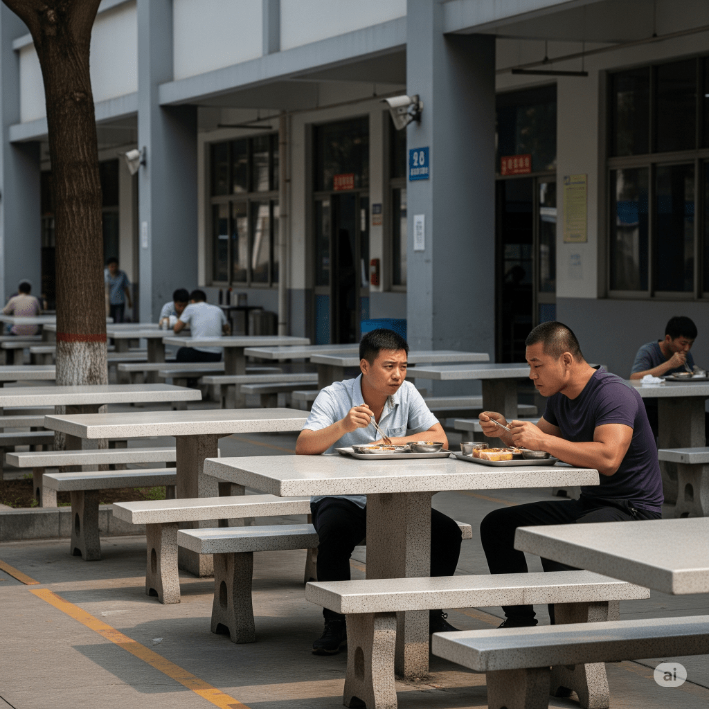 The next day, most workers filled the cafeteria. I sat outside instead, on the cold concrete benches that felt like interrogation slabs.