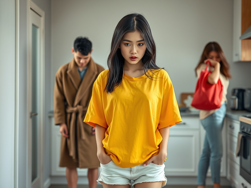 Hua’s intrusion loomed: she dropped her bag on the table with a thud, strutting through the house with all the sharpness of someone who wanted to make a point. “Well, well, well,” she smirked, scanning you up and down, forcing you to shrink into yourself. “Seems like I’m not the only one who’s ‘moved on.’” You shrank slightly, still clasping your hands in front of you.
