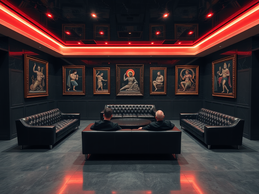 Inside, wealth cloaked decay. Black leather couches, porcelain tiles, marble-like ceilings—all drowned in an eerie red glow. The geometry was deliberate: a box without windows, a trap disguised as a lounge. Erotic paintings filled the walls like frescoes of corruption—gods writhing with mortals, orgies frozen mid-ecstasy, decadence parading as art.