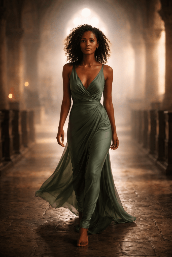 She’d changed again. High-waisted trousers. A cropped top. Bare shoulders. Youthful, electric. She spins, arms out, letting the space take her.